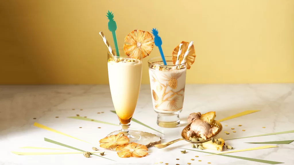 - For the lassi: Blend coconut yoghurt, frozen banana, ground cardamom, OKUSHAL GINGER & PINEAPPLE, ice and blend until smooth.