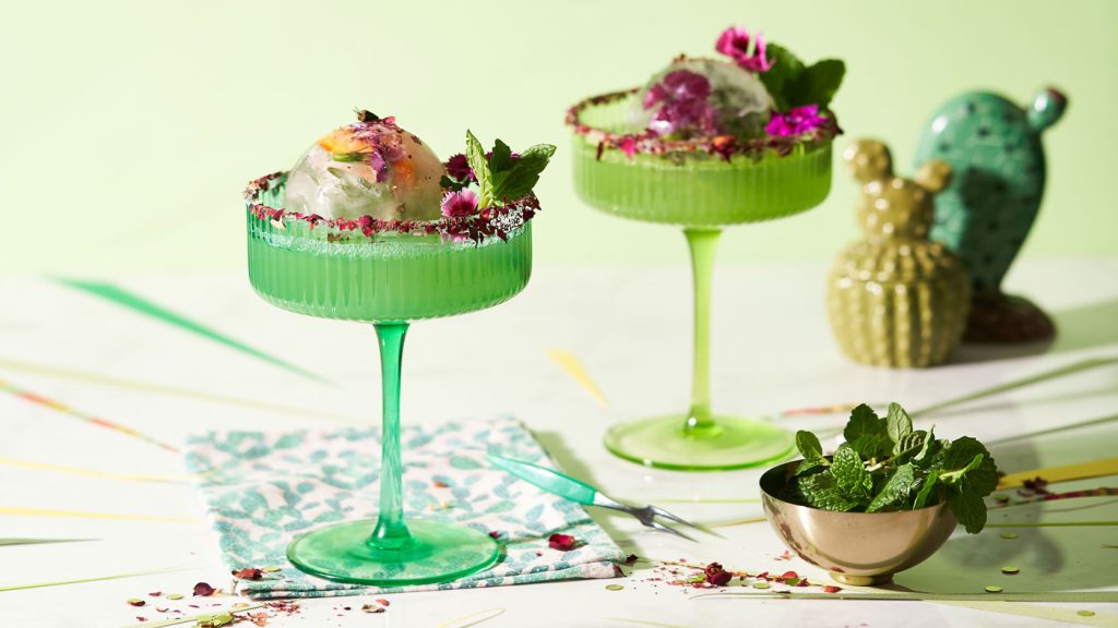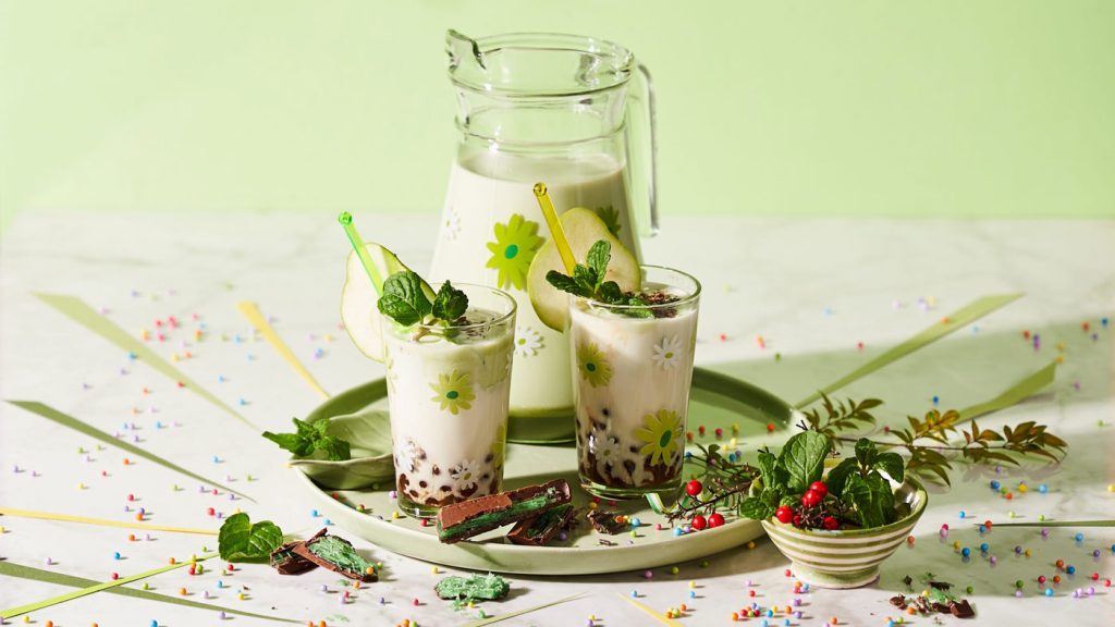 - Add OKUSHAL PRICKLY PEAR & MINT to a cocktail shaker with oat milk and a tiny dot of green food colouring. Shake to combine flavours.